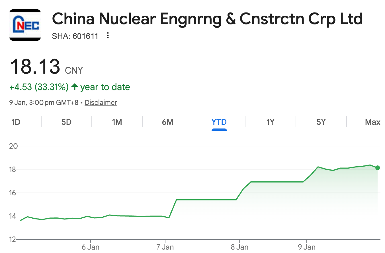 This benefits state-owned contractors like China Nuclear Engineering & Construction (SSE:601611), which is positioned to capture nuclear infrastructure spending. The stock rallied 33% in just the first week of 2026.